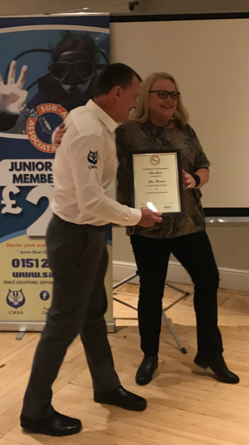 There was no doubt that Cherie Winnard of Mansfield & District Scuba Diving Club, SAA no. 942 thoroughly deserved this award. She has been Diving Officer of the club for more than eight years. During this time she has been proactive in helping the club to move forward, encouraging members to extend their development by attending SAA courses. She is also active in the training of new members within the club. Cherie has also been O2/EDFA Co-ordinator & Y&H rep for the last 2 years but unfortunately has had to retire from these positions due to ill health. Cherie was unable to attend the AGM, but her award was received by a member of her club Chris Kean.